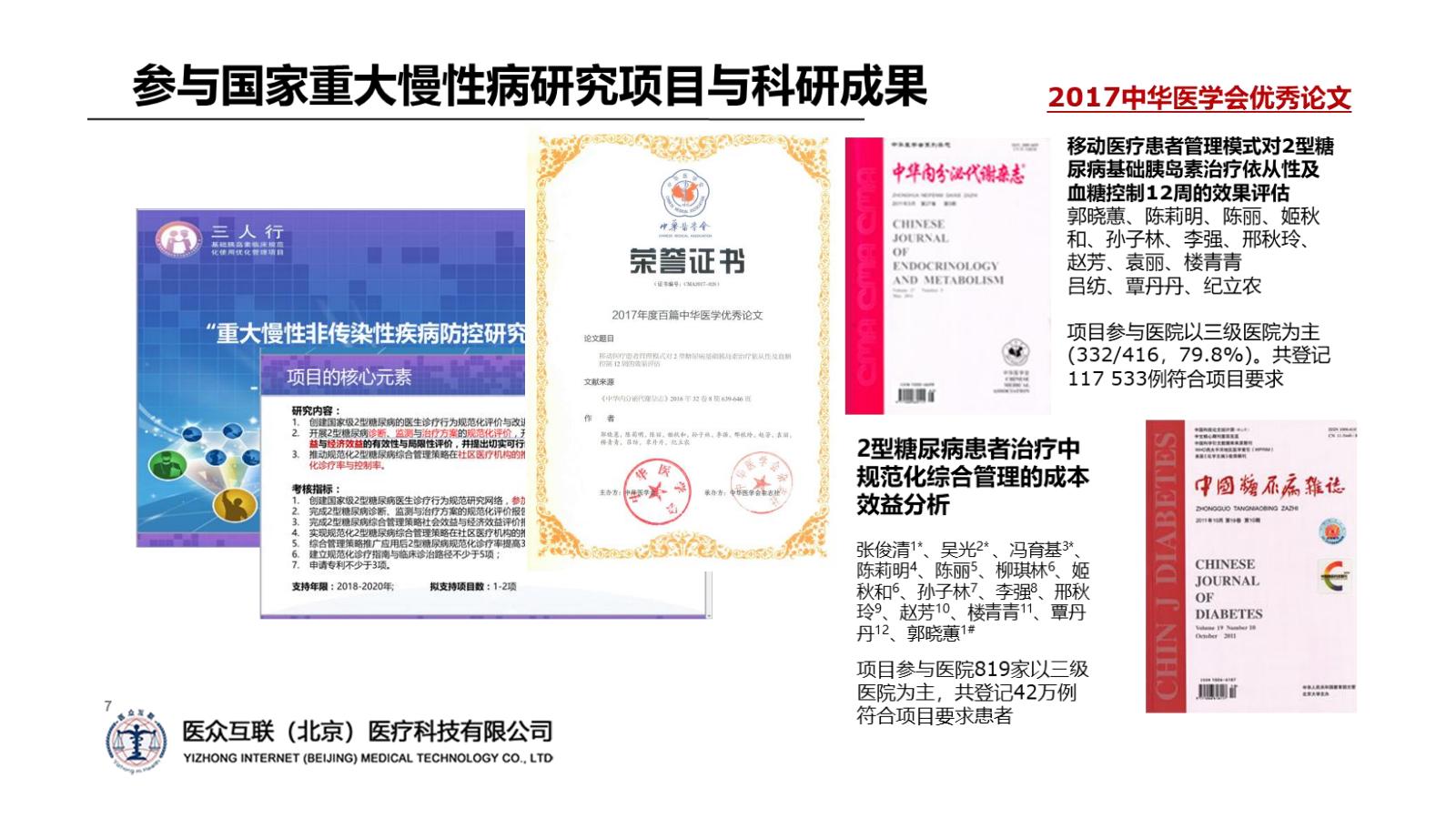 医众互联通过提倡与进行慢性病管理医学研究,及时有效评估慢性病管理中未被满足的医学需求,并通过与政府医疗卫生机构、卫生研究机构,国际医疗公司的合作而制定旨在以提高卫生经济效益的策略和措施,扩展慢性病的诊疗和管理范围,提高依从性,降低门诊流失率,提高人民健康质量。